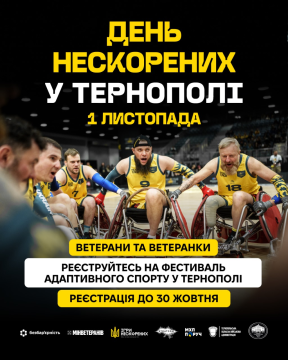 1 листопада Тернопіль прийматиме «День Нескорених» — спортивний захід для ветеранів/-ок війни, організований Мінветеранів, спільно з проєктом «Ігри Нескорених» в Україні, Центром стратегічних комунікацій Stratcom Ukraine, Тернопільською обласною військовою адміністрацією та Тернопільською міською радою. Подія відбувається у межах програми підтримки військових, ветеранів/-ок та їхніх родин "МХП Поруч".