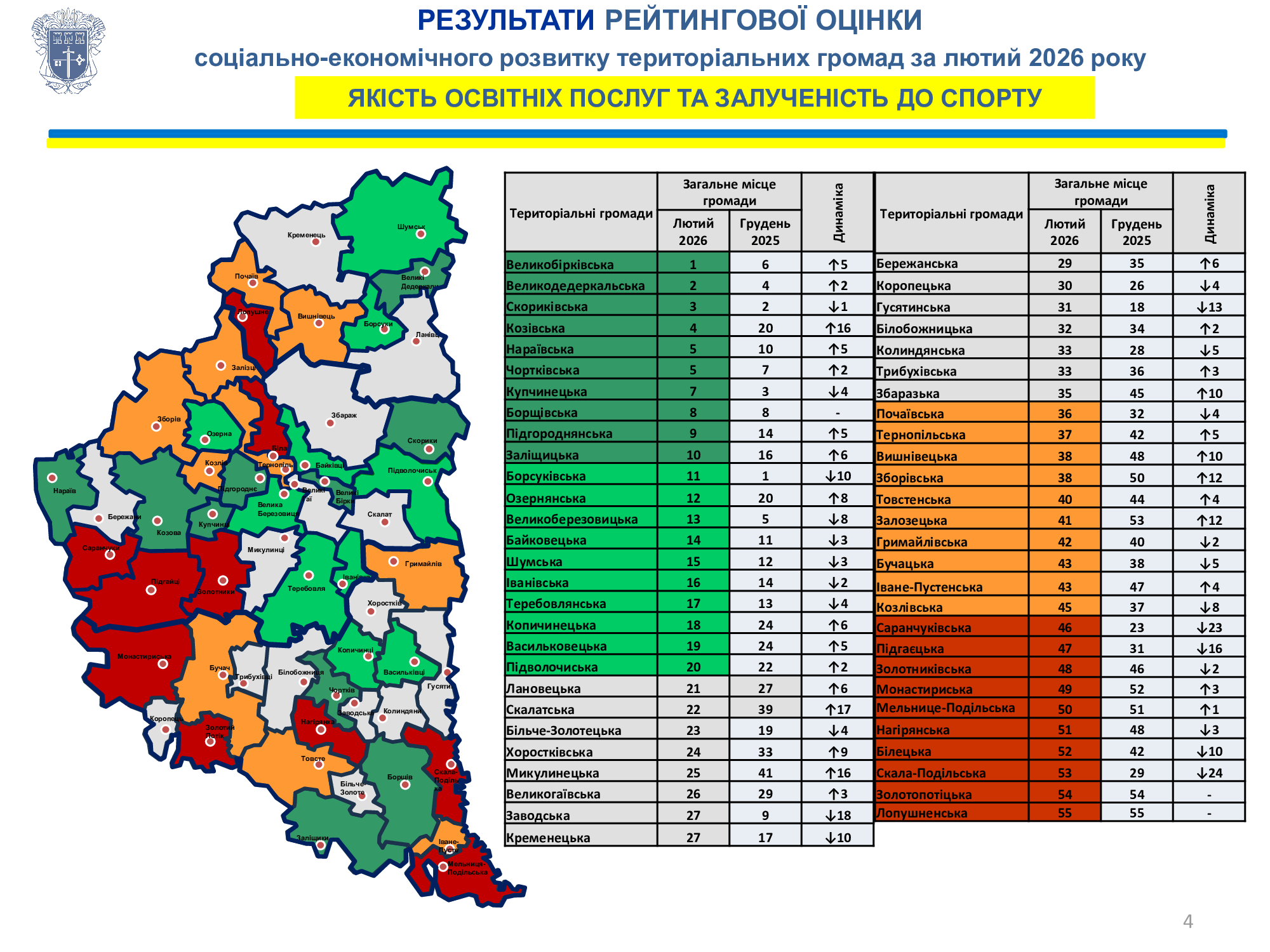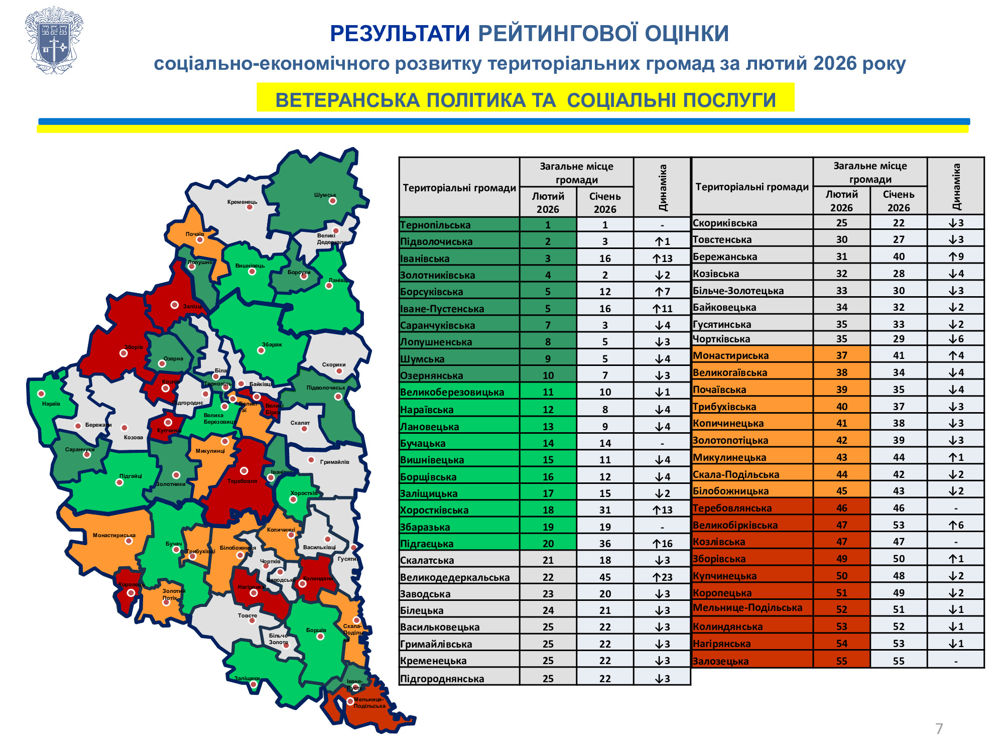 З метою підвищення ефективності управлінських рішень, фінансової спроможності місцевих бюджетів, надання якісних та доступних послуг жителям територіальних громад обласною військовою адміністрацією щомісяця здійснюється рейтингова оцінка соціально-економічного розвитку територіальних громад відповідно до Методичних рекомендацій, затверджених розпорядженням начальника обласної військової адміністрації від 08 травня 2025 року № 287/01.02-01 „Про проведення рейтингової оцінки соціально-економічного розвитку територіальних громад області” (зі змінами). З текстом Методичних рекомендацій та показниками, за якими здійснюється рейтингова оцінка, можна ознайомитись у файлах нижче.